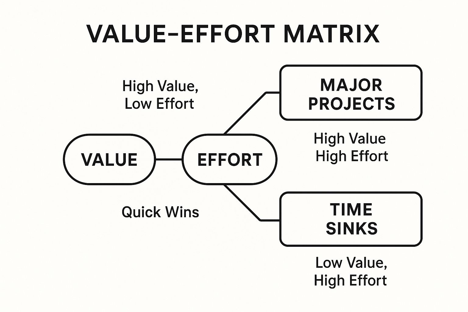 Value vs. Effort Matrix | Low - quick visual mapping | Low - minimal preparation | Visual prioritization into 4 quadrants | Initial screening of ideas and stakeholder alignment | Highly visual, intuitive, adaptable definitions of value |